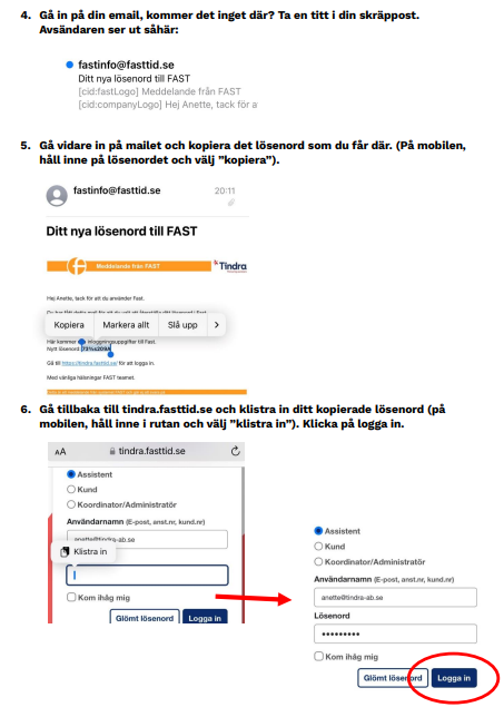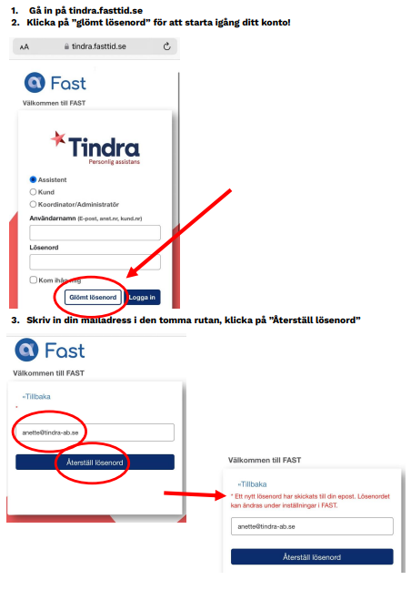 Du surfar in på tindra.fasttid.se och klickar “Glömt lösenord” och därefter skriver du in din emailadress. Du får då ett lösenord som du använder för att logga in. Ditt användarnamn är din emailadress.